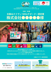 「古着deワクチンまごころプロジェクト」をご利用の企業・団体様がPRできるエビデンスの一例として、「古着deワクチン」SDGsサポーター企業の認定書が発行されます。
