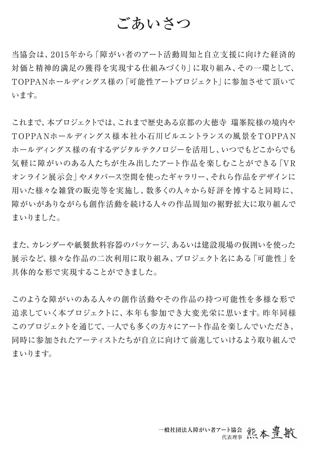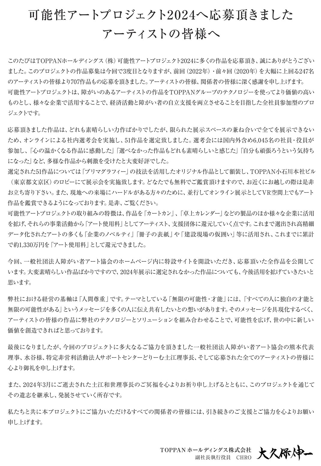 「可能性アートプロジェクト2024」結果発表にあたり、TOPPANホールディングス株式会社 代表取締役社長 麿 秀晴 様より、ご応募いただきましたアーティスト様へメッセージを頂いております。