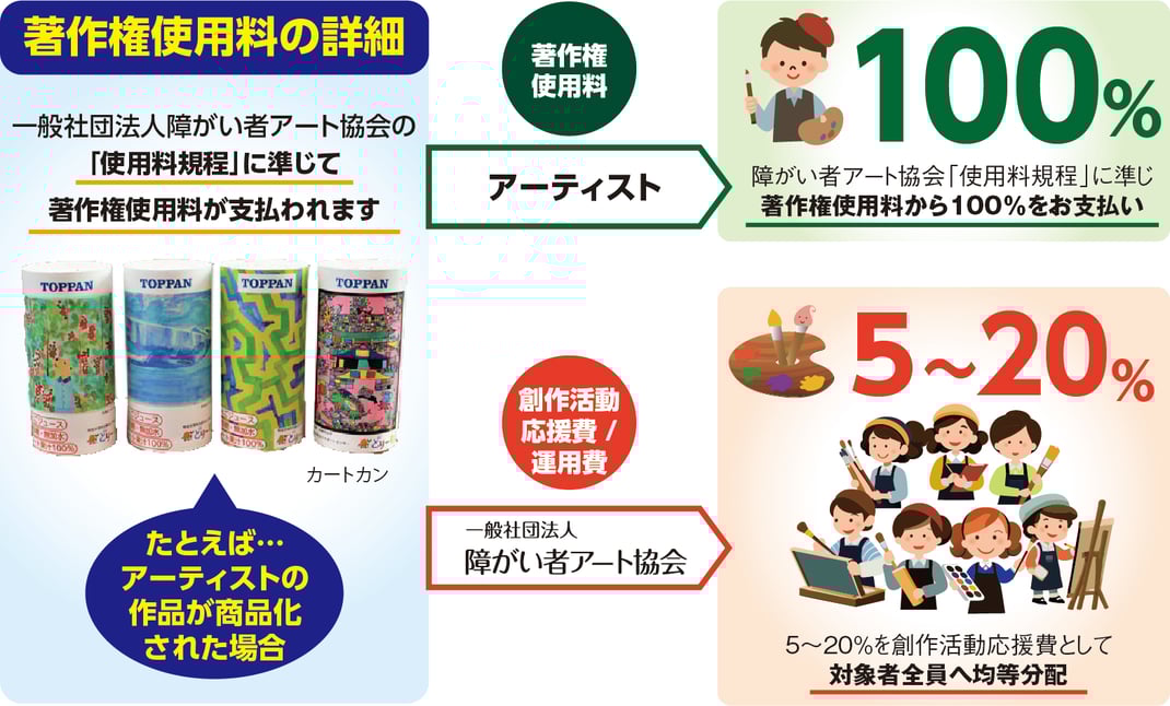 可能性アートプロジェクトへご応募いただいた作品が、商品化等の著作物の二次利用に採用された場合、障がい者アート協会「使用料規程」に準じた著作権使用料(一部個別の著作権使用料が設定されている場合もございます)を、障がい者アート協会を通じてお支払いします。